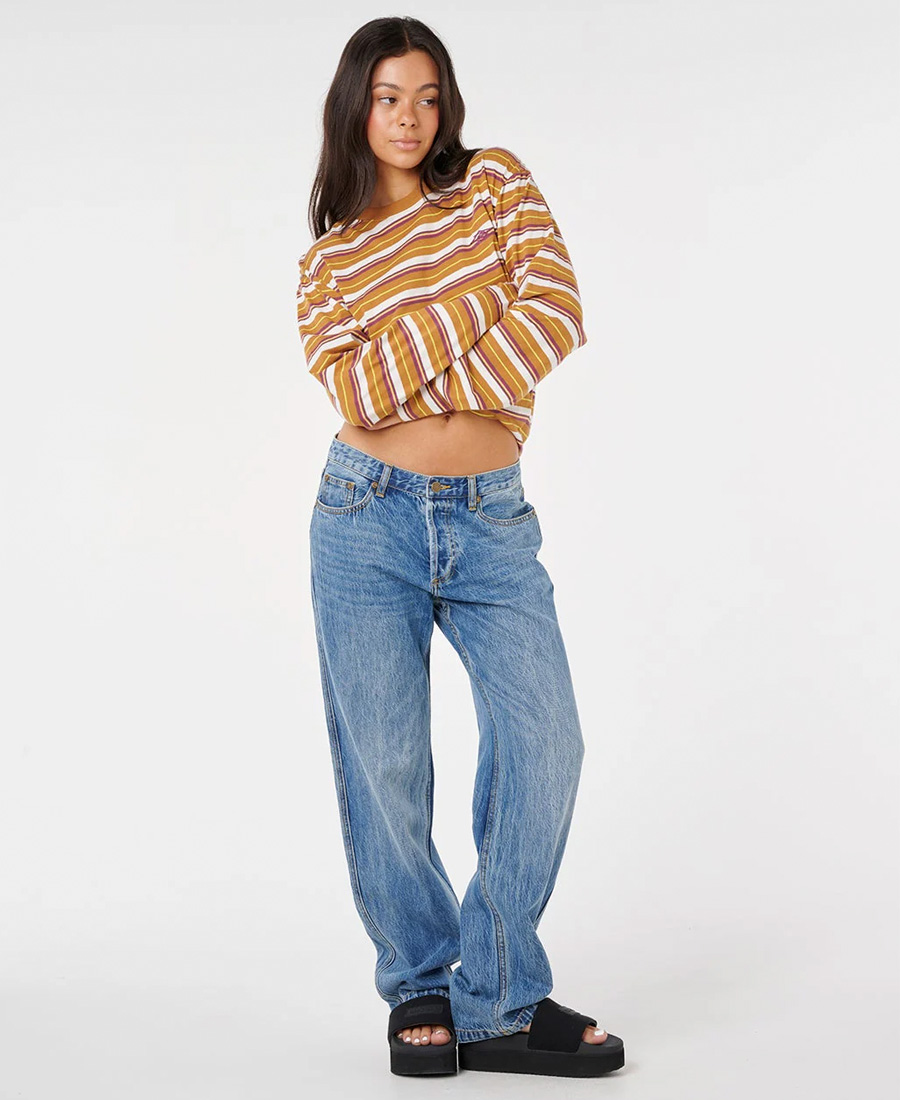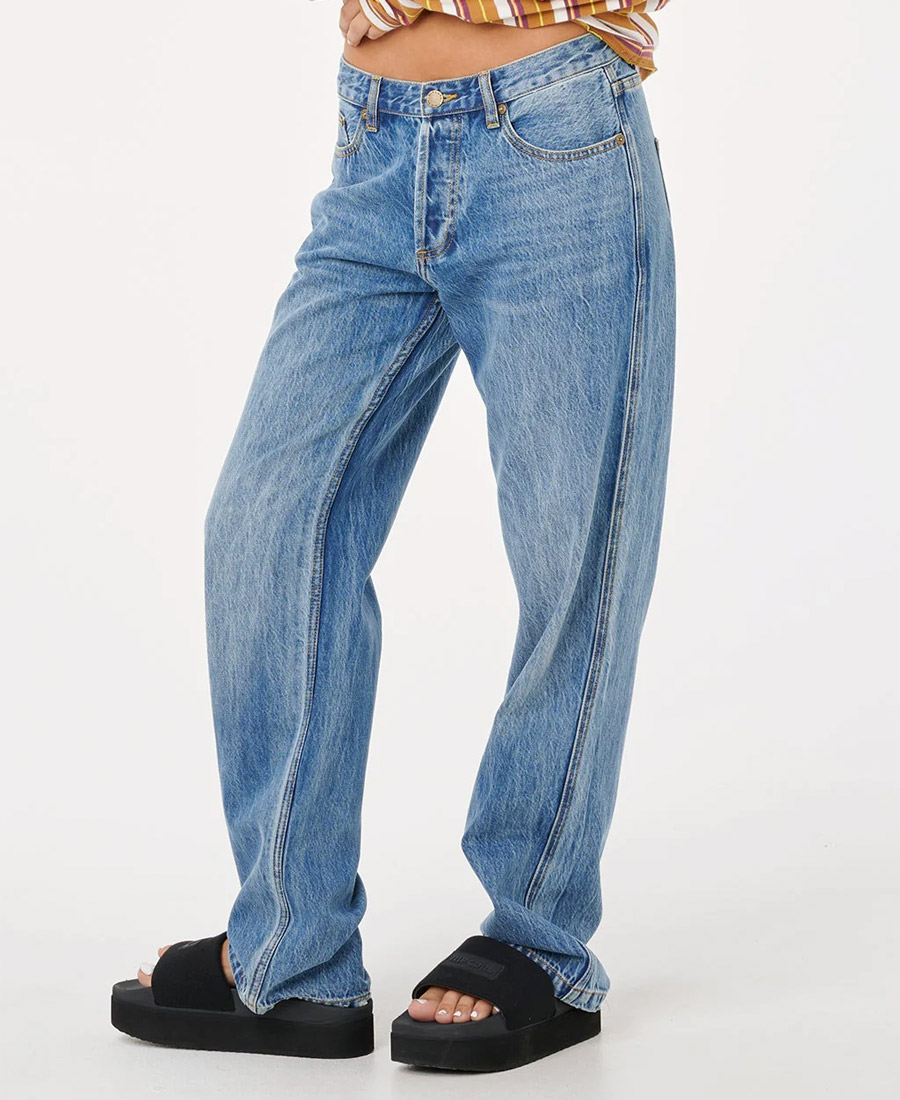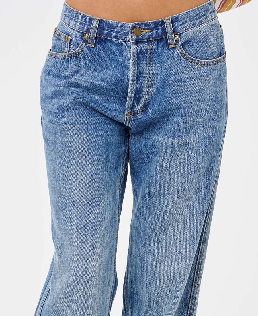 Jean Rip Curl RLX SG. DENIM RÍGIDO BLUE. RELAXED FIT. Tiro MID. Avios metálicos. Etiqueta en bolsillo trasero. Cartera con botones. Multietiquetas. 100% Algodón.
